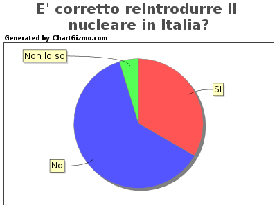 a few weeks, I opened a poll on "Reintroduction of nuclear energy in Italy" , a subject quite in vogue at the beginning of last summer. The results of the survey (above the graph) with the question: 'E' right to reintroduce nuclear energy in Italy " were 7 (33%) for SI, 13 (61%) for NO and 1 ( 4%) with DO NOT KNOW . In September I wrote a text about this topic, where I support my own argument and try to justify it through the topics. It is therefore a text argument with the thesis: "No to nuclear power." You can read below.
